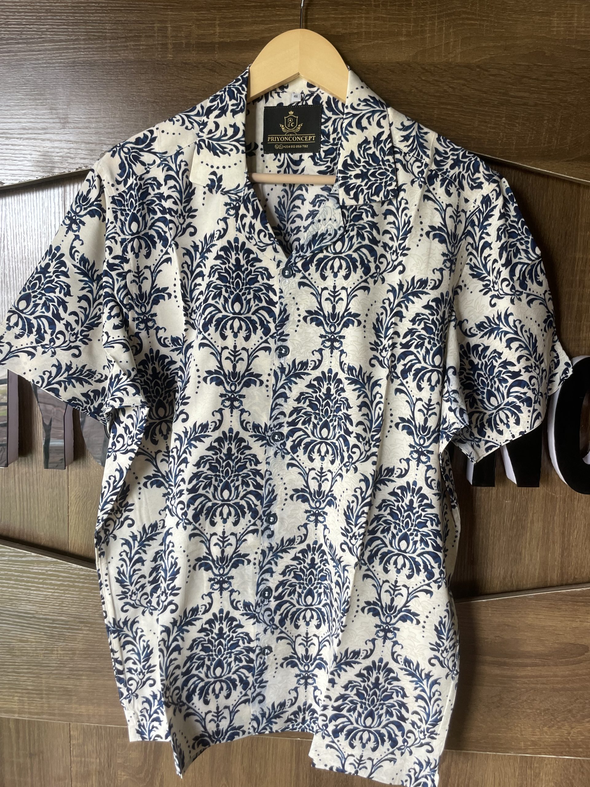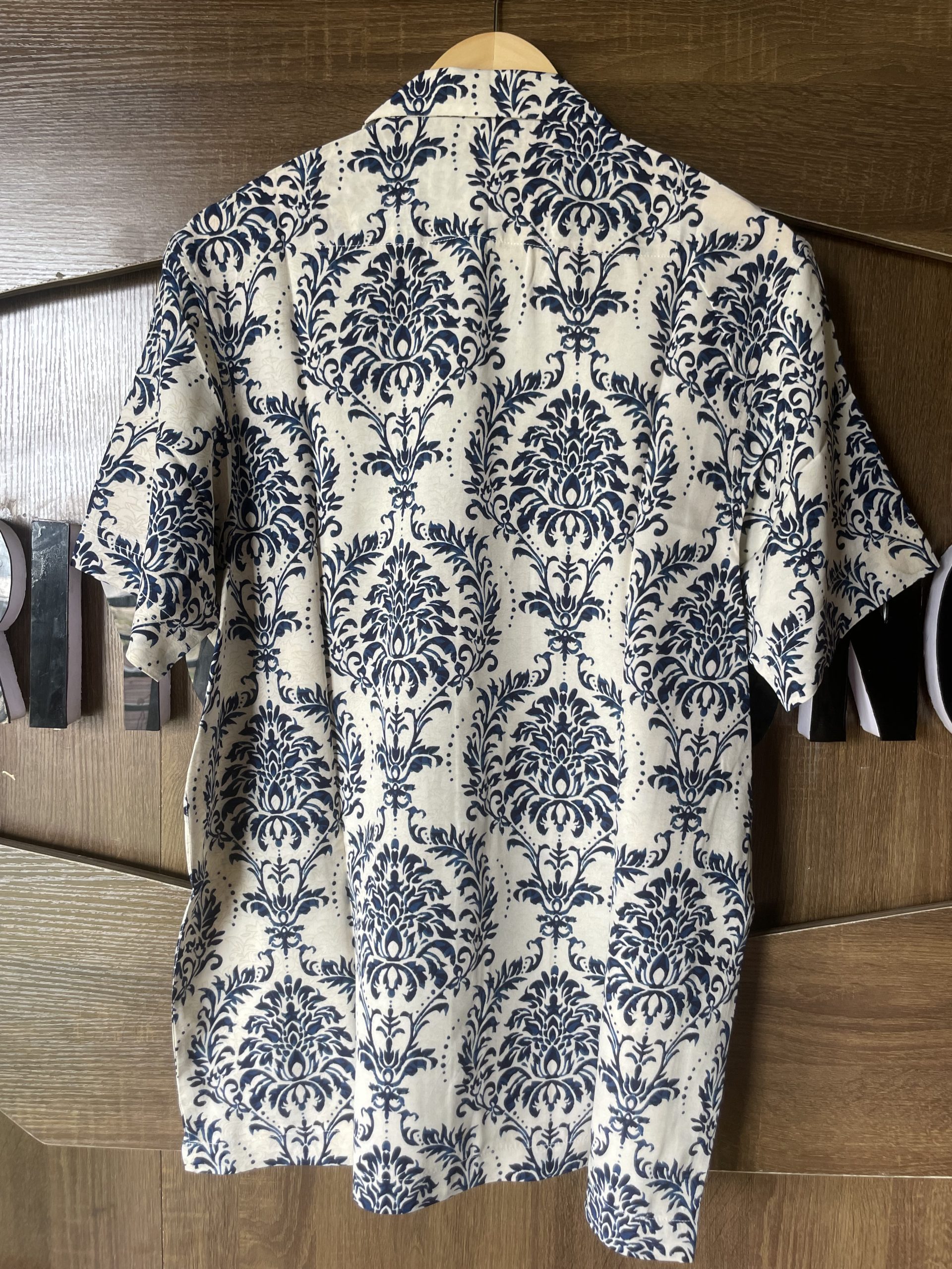 A classic short-sleeve button-down featuring a striking deep navy damask pattern against an off-white background
