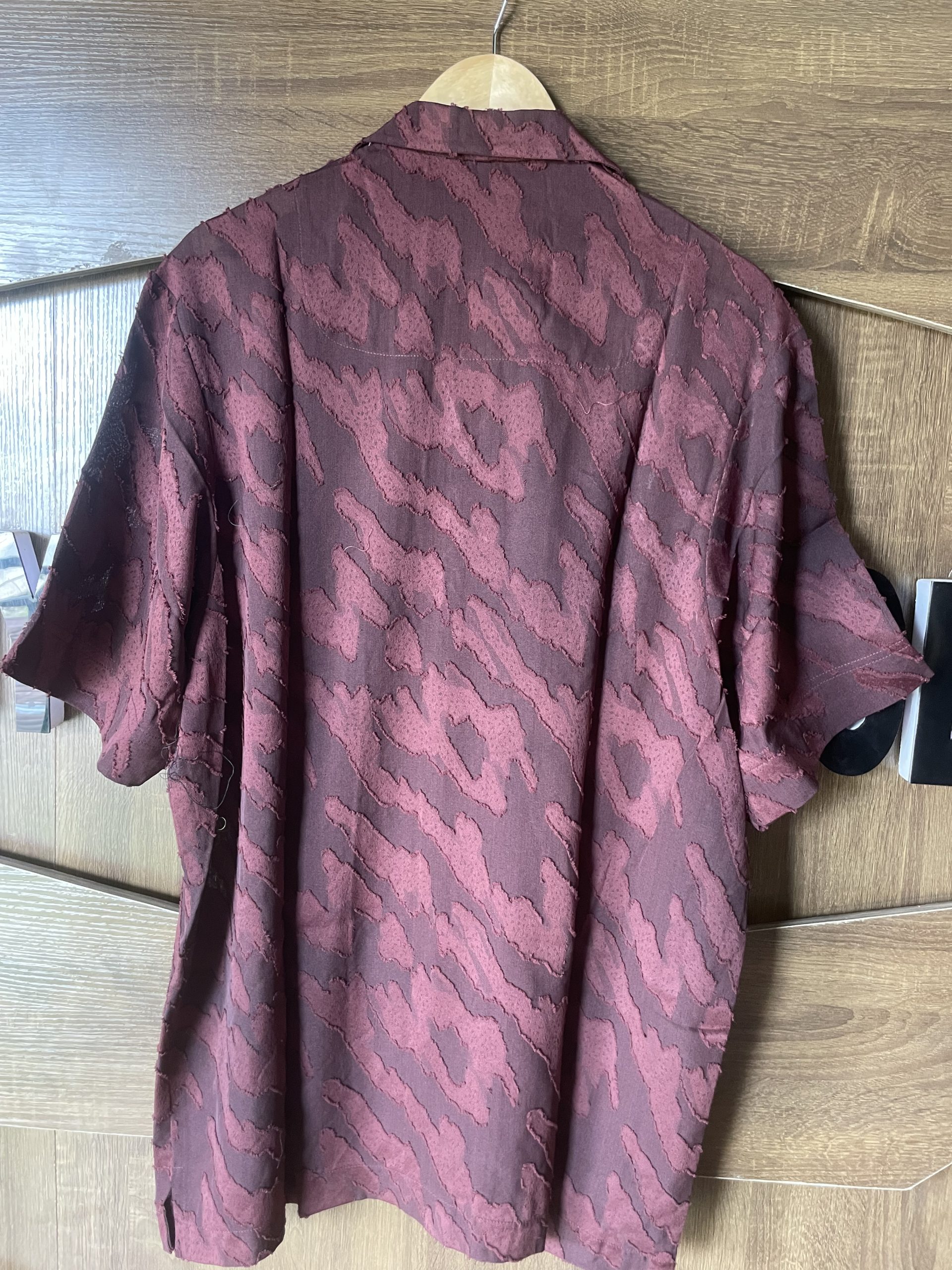 A rich maroon short-sleeve shirt with a distinctive raised, textured fabric pattern. Offers a sophisticated look with a relaxed fit.